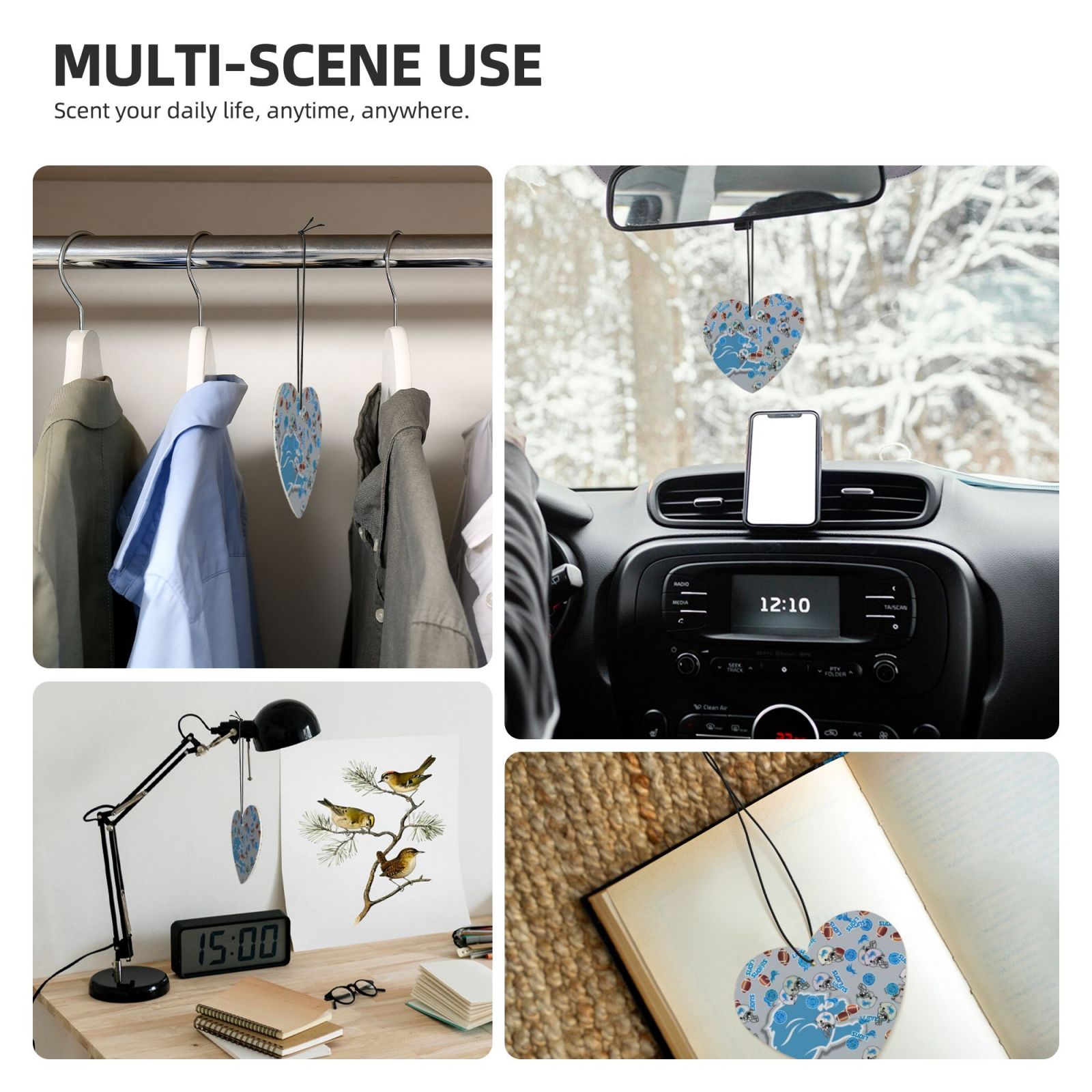 【 Design Description 】 Two sided full width printing, 【 Material Description 】 Offset Paper, 【 Product Performance 】 The operation is simple and convenient, and the fragrance tablets can not only be used for car decoration, but also for refreshing the air. It can be directly hung in the necessary places, such as, bedrooms, wardrobes, shoe cabinets, cars, etc. Tear off the packaging to use. Fragrant tablets are long-lasting, fresh, beautiful, and practical. Reasonable size, light weight, durable, and can be used with confidence., 【 Applicable scenarios 】 Suitable for use in vehicles, rooms, bathrooms, headboards, and other places., 【 Accessory Structure 】 Four aromatherapy patches (lavender scent, including hanging rope and plastic wrap)., [Washing instructions] Do not wash with water, do not wipe., [Special note] Due to different measurement methods, the error in this size data is within 0.5cm., 【 Reminder 】 The display effect of this picture is for reference only, and the final effect is subject to the actual product! Due to objective factors such as production batches, machinery and equipment, it is difficult to avoid, or there may be slight color differences, position and size errors. If these problems occur, they are normal phenomena and will not be included in the scope of after-sales treatment.,